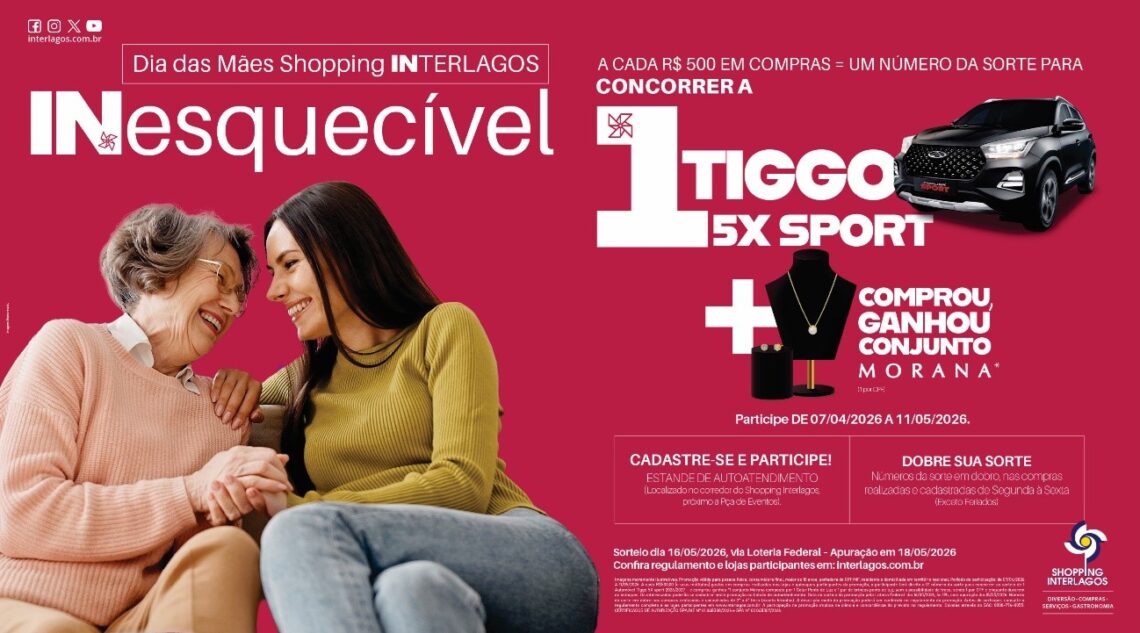 Aqui no Shopping Interlagos a celebração para as pessoas mais queridas da família começa mais cedo. A partir de hoje (07/04) até 11 de maio de 2026, acontece a Campanha do Dia das Mães, com prêmios que prometem encantar os clientes: um automóvel Tiggo 5X Sport 2026/2027, 0km, e um conjunto da marca Morana, no formato comprou e ganhou.