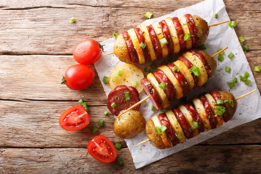Espetinho de batata e linguiça
